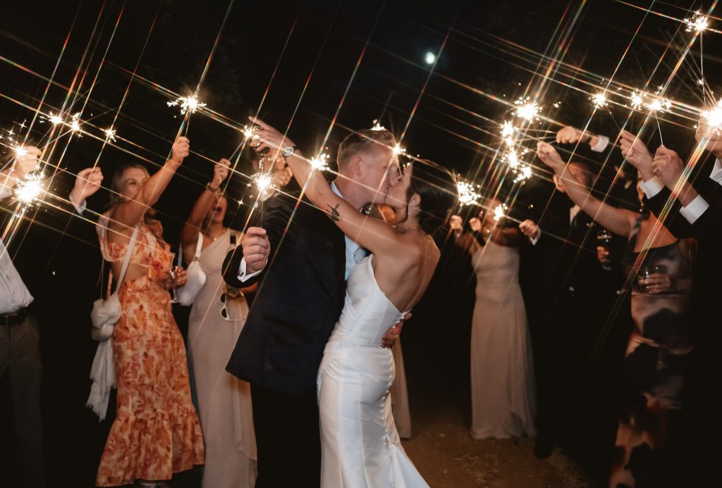 A sparkler exit is a popular way for a newly married couple to make a grand exit at the end of their wedding reception. In a sparkler exit, the guests line up on either side of a designated exit path and hold lit sparklers, creating a tunnel of light for the couple to walk through or simply do a semi-circle with a handful of your wedding guests.